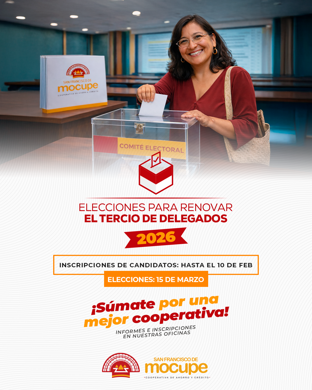 El Comité Electoral de la COOPAC San Francisco de Mocupe abre las inscripciones para que nuestros socios participen en la renovación de delegados. Esta es una excelente oportunidad para que formes parte activa de nuestra comunidad cooperativa, aportando tus ideas y representación.